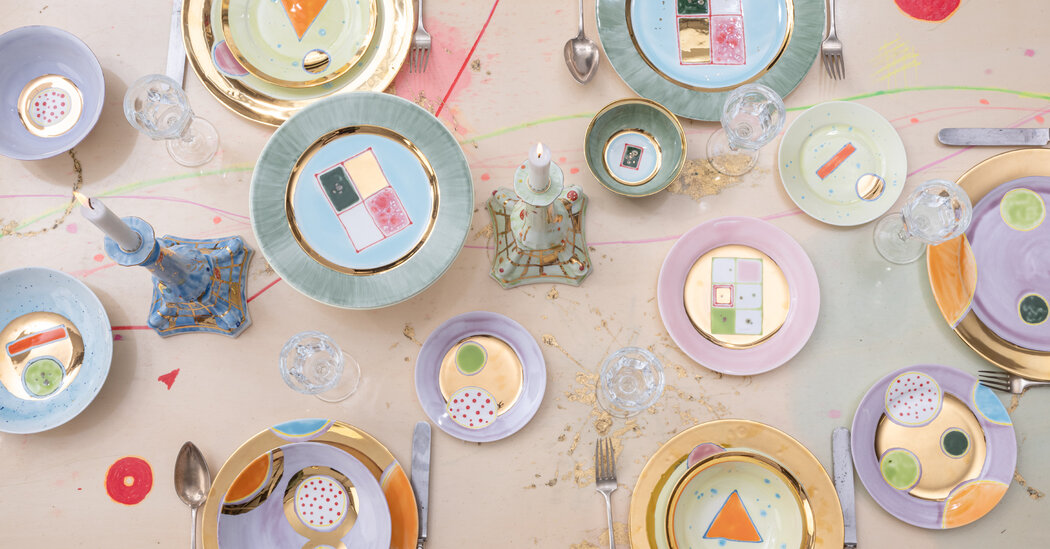 The Roman designer and artist Coralla Maiuri conceived her Impressions Gold tableware to dazzle with geometry. Hand-drawn circles, triangles, grids and dots filled with pastels and gilded patches come into exuberant collision. From $78 for the Lime Gold Bread Plate to $358 for the Plum Gold Rim Charger; corallamaiuri.com.