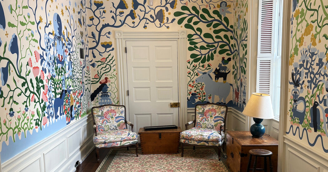 Even an often-overlooked area, like a stairwell, is not immune to a muralist’s palette. Kreh Mellick, an artist in Asheville, N.C., recently painted one in a family member’s home in Virginia. Ms. Mellick took the stairwell from plain to whimsical, adorned with stars and a dress-clad sun ascending over flowers and a blueberry patch.